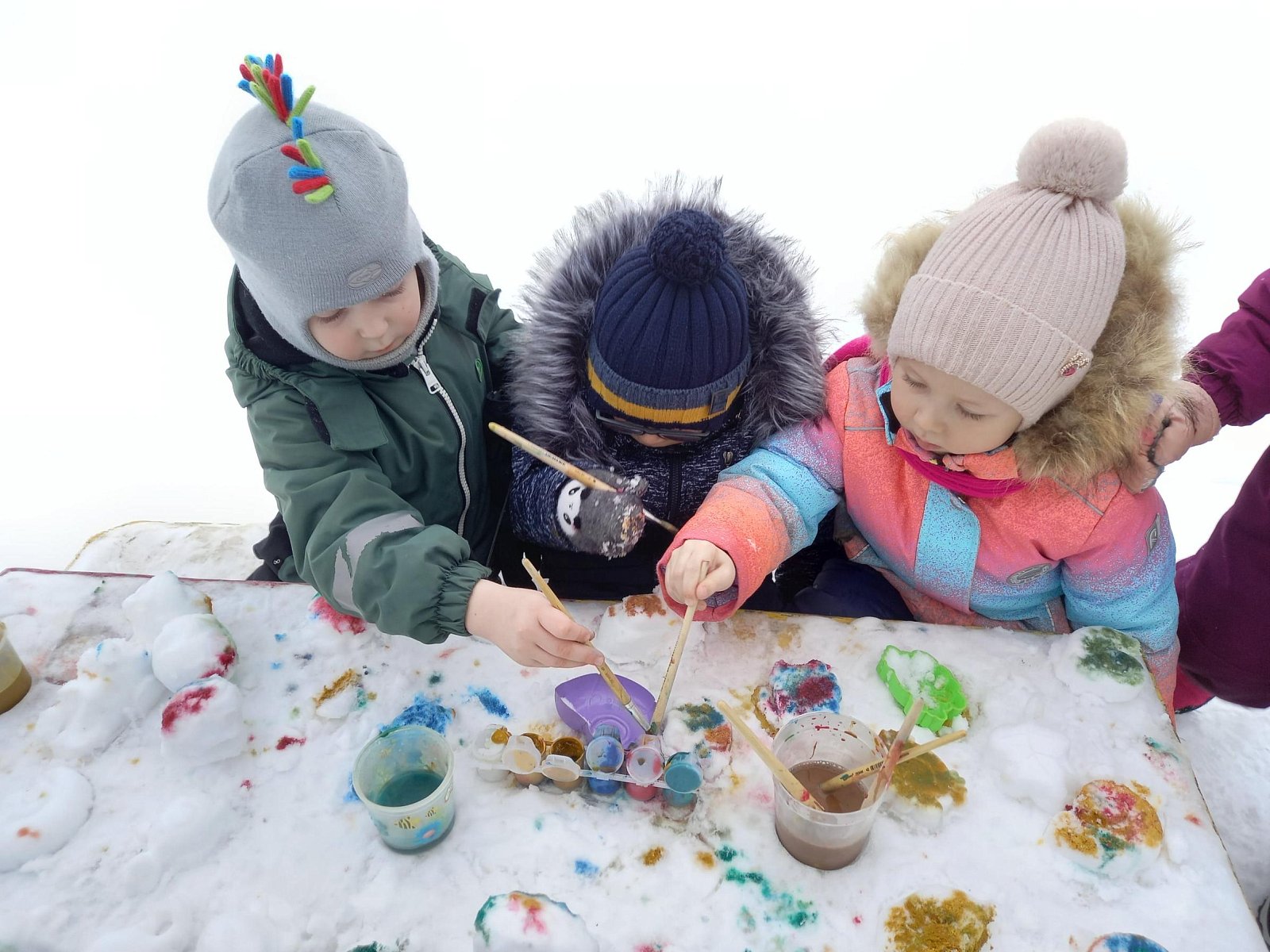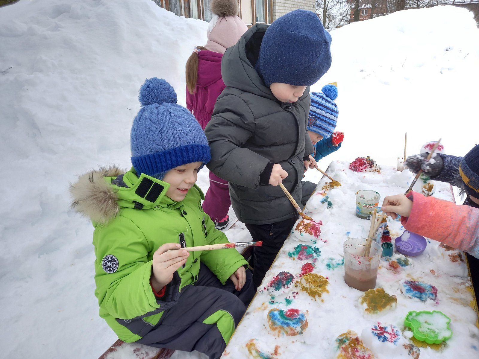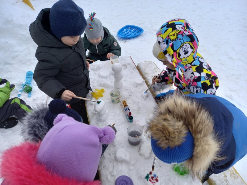 Рисование на снегу – это не только веселые занятия во время прогулки. Это и творчество, и познание ребенком окружающего мира. Ведь рисовать «цветной водой» на снегу- это большее удовольствие, чем рисовать карандашами или красками на бумаге. Дети получают положительные эмоции, поэтому для дошкольников творчество – это не только результат в конце работы, сколько сам процесс. И не столь важно, насколько правильный рисунок получится, главное ребенок проявит свою фантазию и получит удовольствие от процесса! Дети старательно рисовали елочки, снежинки, смешариков, разные узоры….