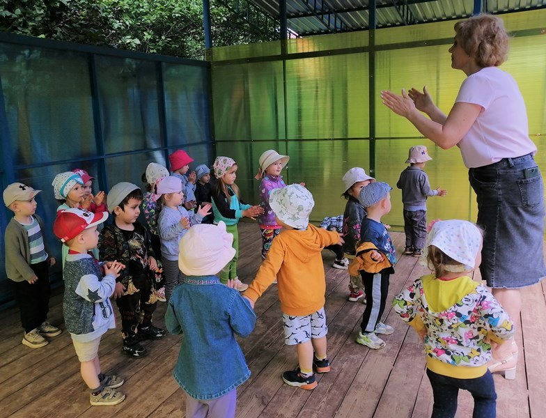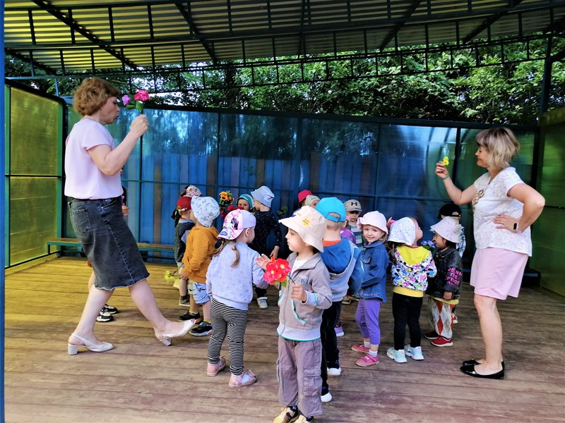 К ним в гости пришёл дружелюбный Мишка, который танцевал и играл с малышами. Дети спели для Мишки песни о лете и станцевали в конце развлечения весёлый «Танец с цветами».