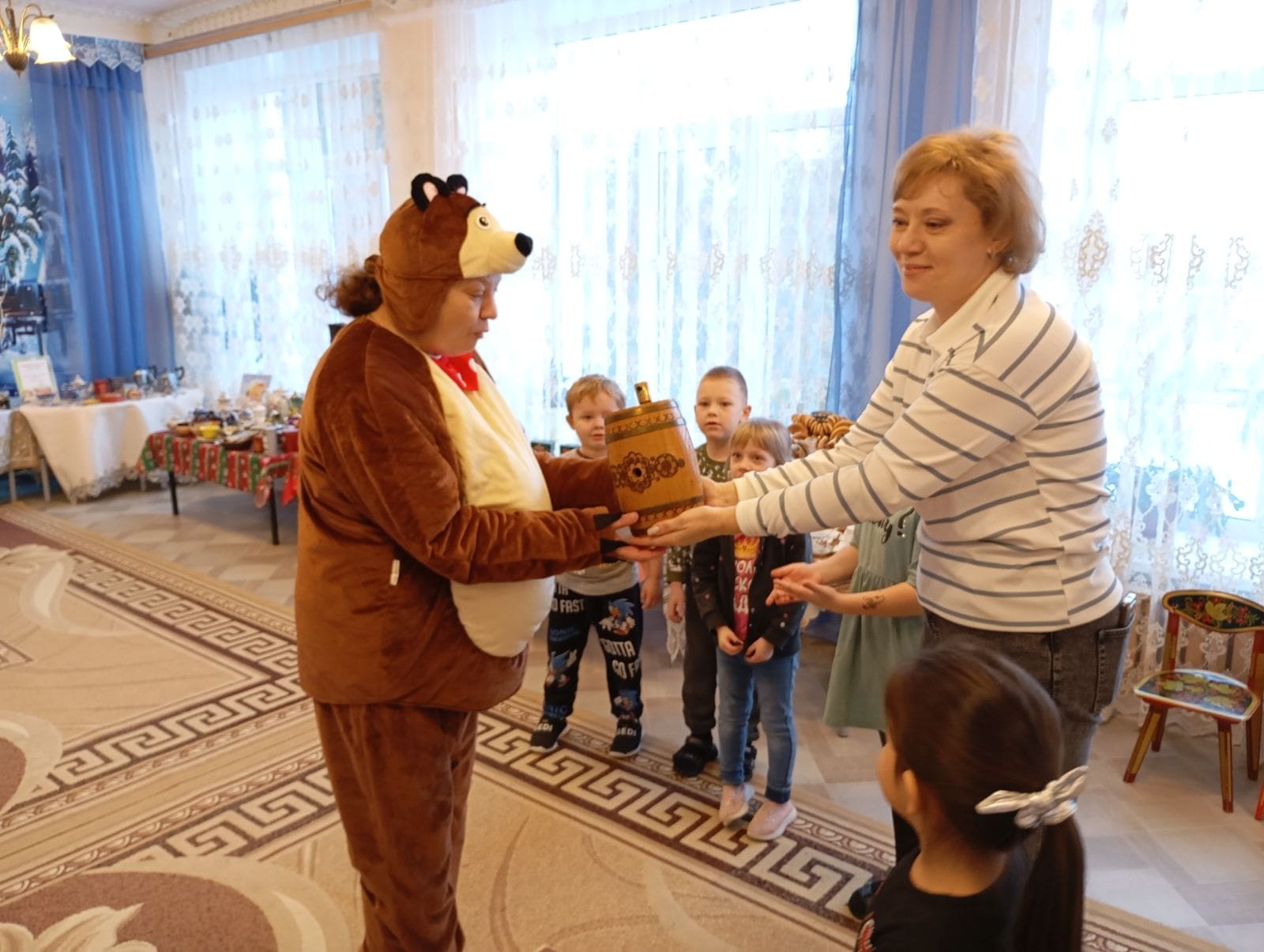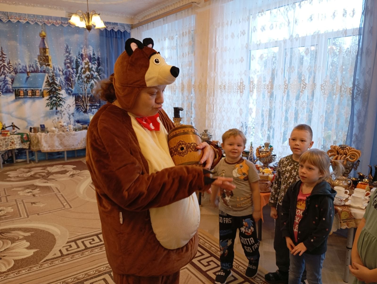 В этот день к малышам в гости пришел медвежонок Мишутка, который рассказал о своей семье, показал, где он живет, чем питается. Ребята вспомнили, в каких сказках они встречали медведей, отгадали загадки о том, что любят эти удивительные животные, пели с медвежонком песни. В игре «Мишка по лесу гулял» дети попробовали изобразить тяжелую походку косолапого медвежонка и с большим интересом поиграли с Мишуткой в веселые игры «Эй ты, Мишка-лежебока», «Вышел Мишка на лужок».