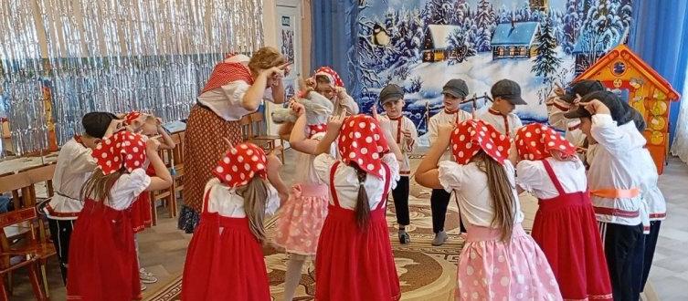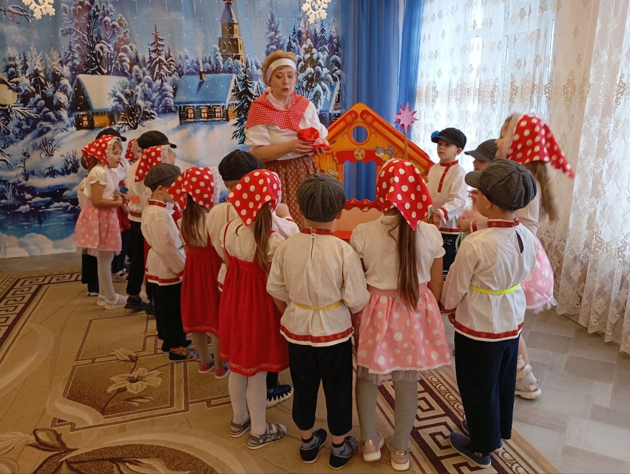 Веселое время на Руси – Святки: и повеселиться можно, и поиграть, и погадать – будущее узнать, а если постараться, то и угощение заработать, спев веселые песенки – колядки. Ребята из группы «Пчелки» окунулись в сказочный мир русского фольклора, примерив на себя образы колядовщиков: мехоноши, звонаря, звездаря. А еще превращались в Козу и Медведя, без которых не обходилось ни одно святочное гуляние, играли в русские народные игры «Платочек», «Пирог» и приняли участие в шуточном гадании