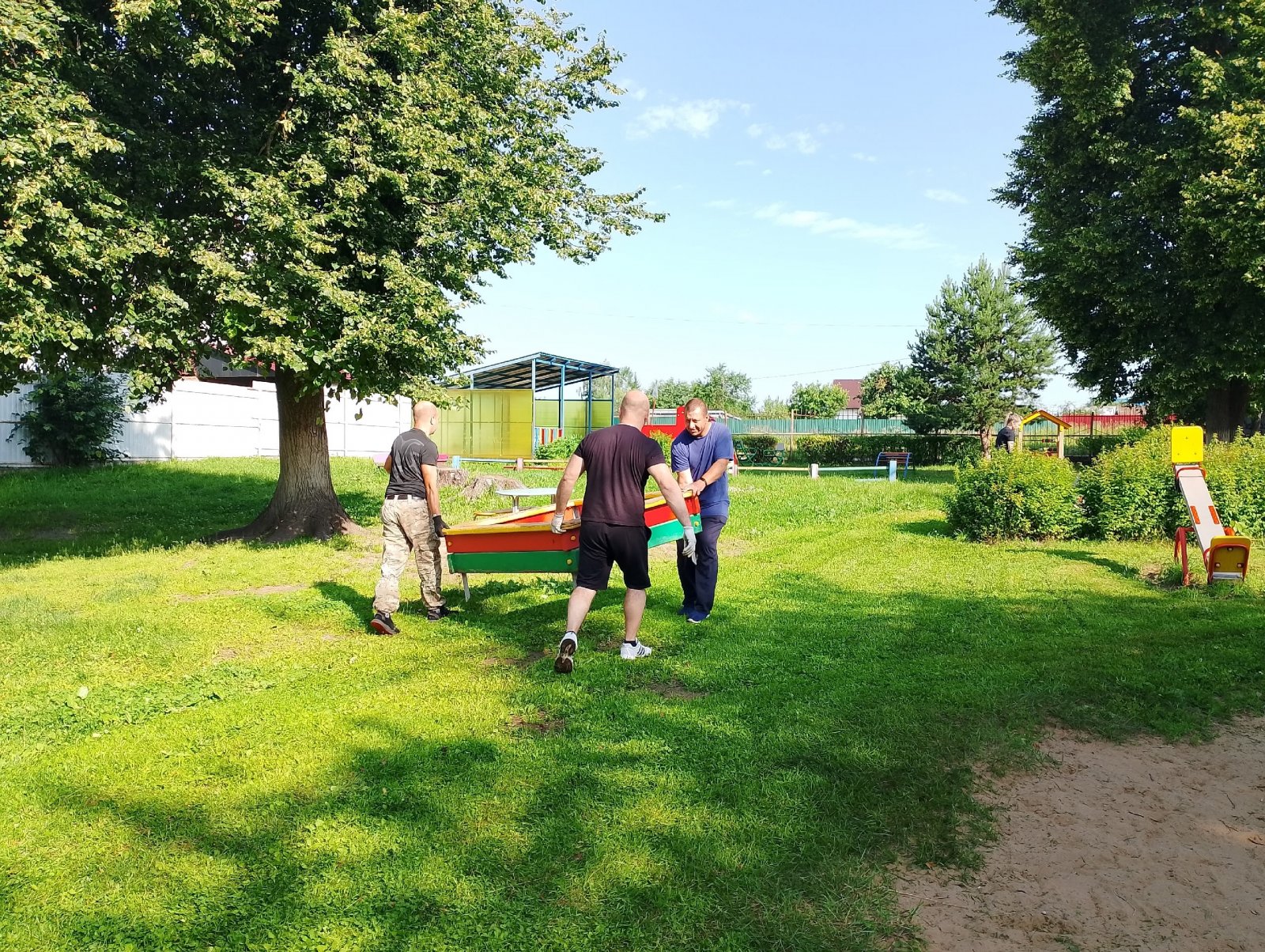 Вместе со своими педагогами наводят порядок на участках. Привезли песок и заполнили песочницы песком для игр детей, изготовили футбольные ворота, покрасили оборудование, покосили, помыли окна в группе, починили кран с водой, подвели воду для полива клумбы, сделали забор в огороде, вывезли строительный мусор и многое другое.