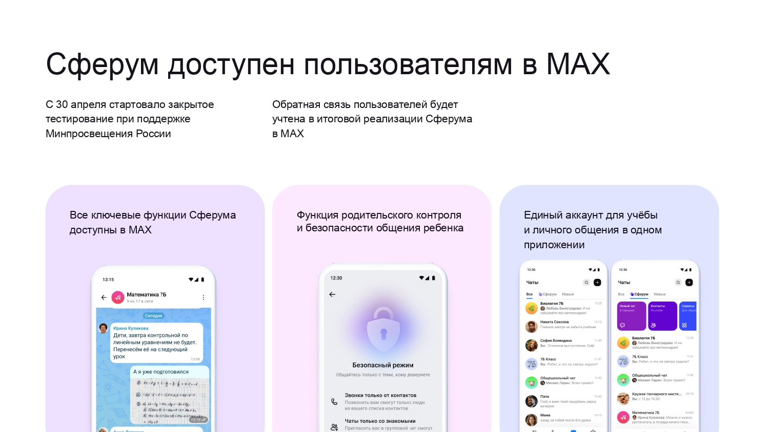 Обращаем ваше внимание, что Постановление Правительства РФ № 1241 продолжает действовать. Это означает, что все коммуникации, связанные с образовательным процессом, должны осуществляться исключительно в пространстве Сферум. Сервис Сферум сейчас проходит процесс интеграции в платформу MAX. Изменения призваны улучшить пользовательский опыт. Сферум в МАХ имеет ряд существенных преимуществ: