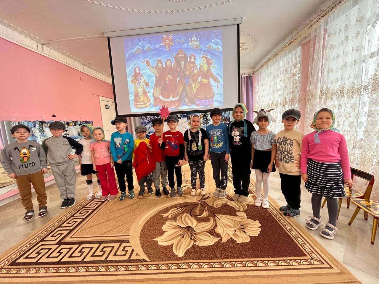 Сегодня ребята подготовительной группы «Смешарики» погрузились в атмосферу народного праздника, превратившись в колядовщиков – так издавна на Руси называли людей, исполняющих веселые песенки – колядки. Узнали, что Святки – праздник, уходящий в глубину веков, а колядование – это хождение по домам с поздравлениями, песнями, забавами и потехами. Ребята узнали, кто такие Звонарь и Мехоноша, познакомились с шуточными гаданиями, играли в русскую народную игру «Пирог», водили хоровод с Козой и Медведем. А самое главное – пожелали друг другу в новом году здоровья, счастья, радости и добра.