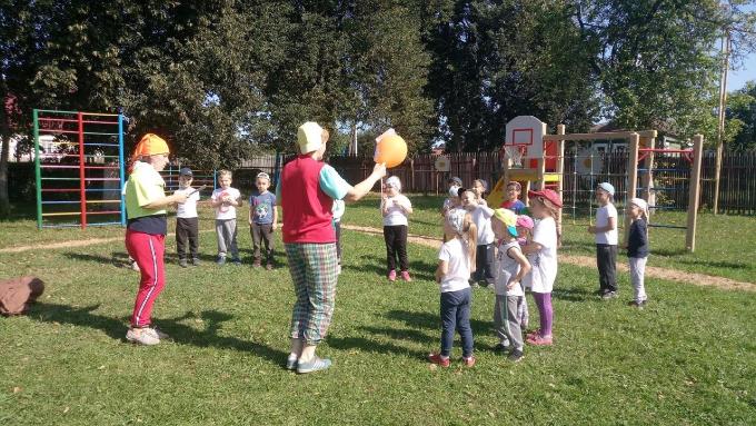Два веселых клоуна – Клепа и Тепа прибежали в гости к ребятам, чтобы посоревноваться в быстроте, ловкости и силе. Веселые эстафеты чередовались с песнями, танцами, стихами о спорте.
