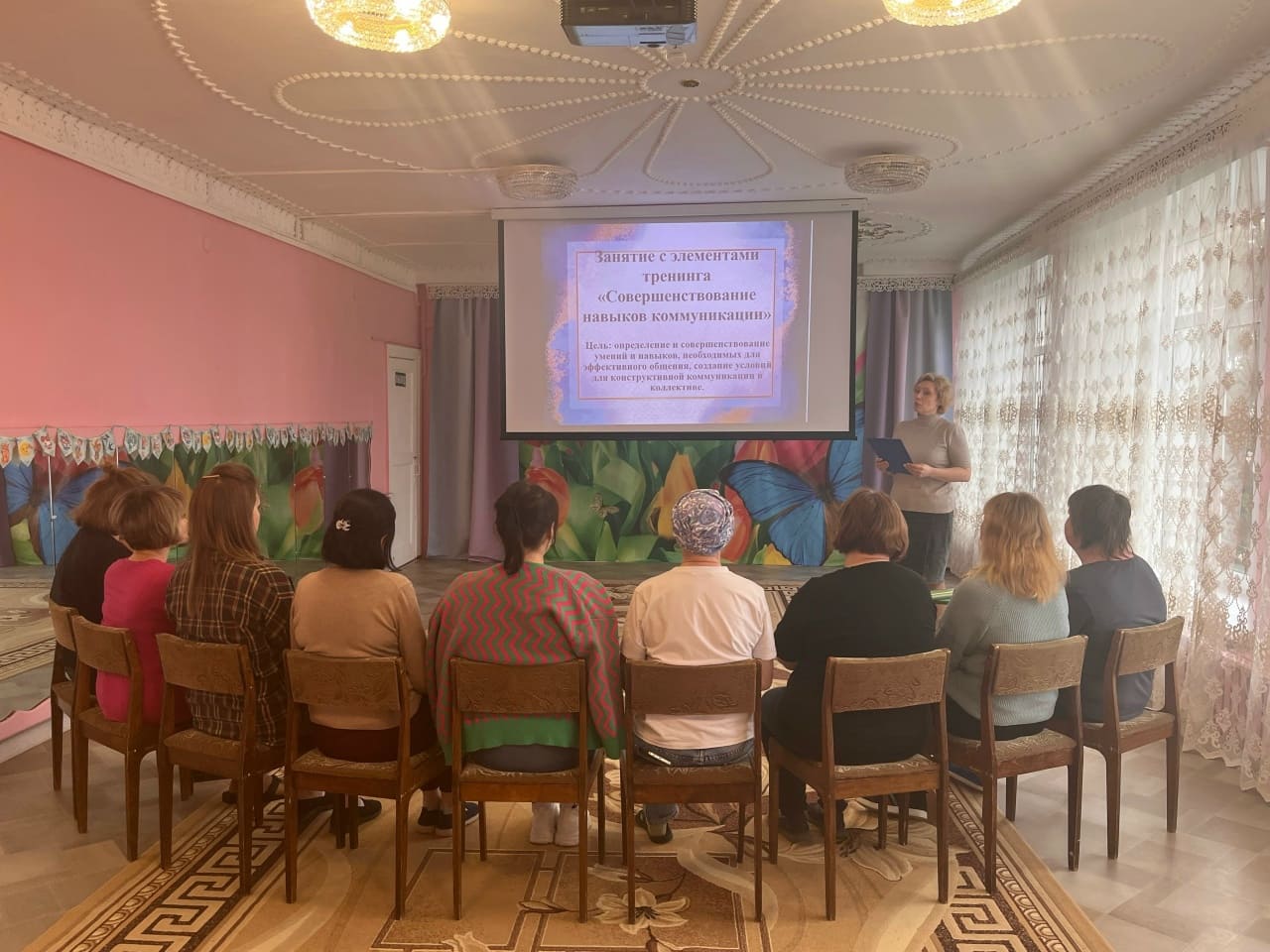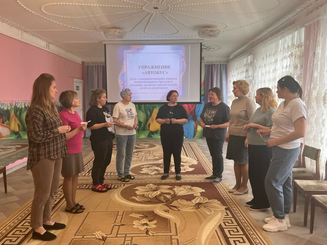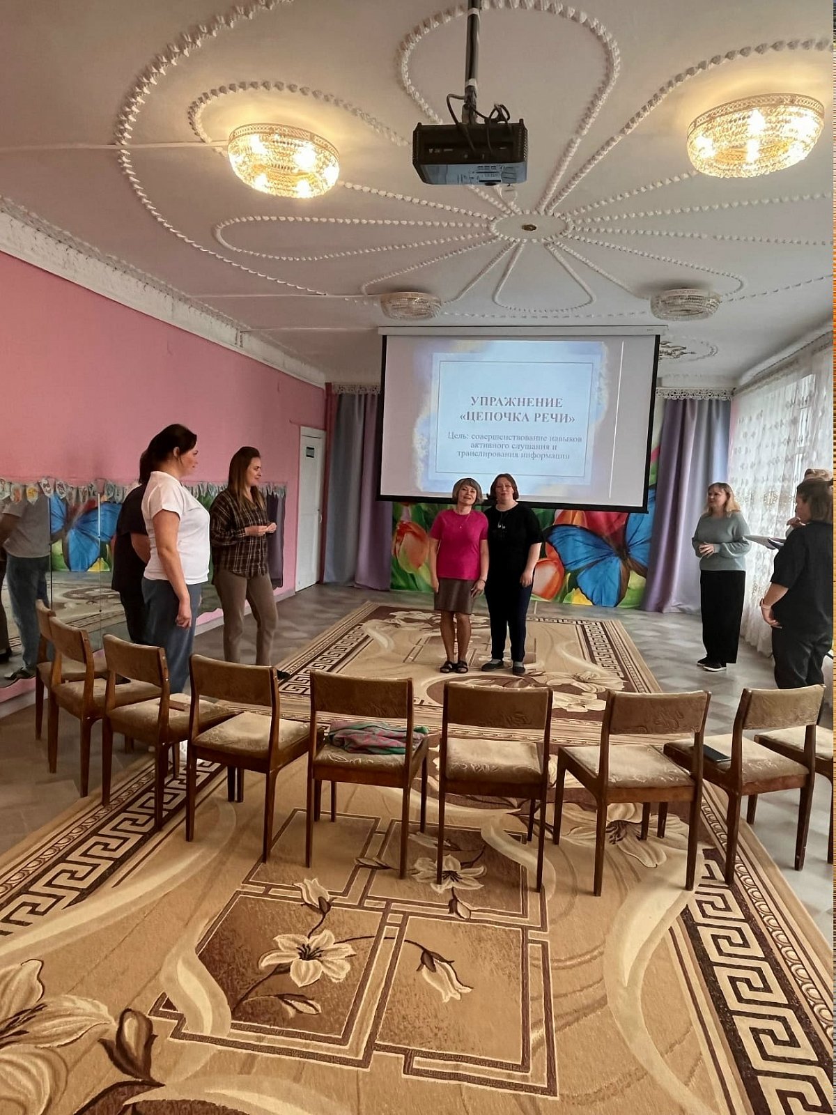 В рамках недели психологии в нашем детском саду было проведено занятие для педагогов с элементами тренинга «Совершенствование навыков коммуникации». Его целью явилось определение и совершенствование умений и навыков, необходимых для эффективного общения, создание условий для конструктивной коммуникации в коллективе. Педагогам было предложено поучаствовать в различных упражнениях для совершенствования навыков общения, примерить на себя разные социальные роли, вспомнить о правилах построения конструктивного диалога.
